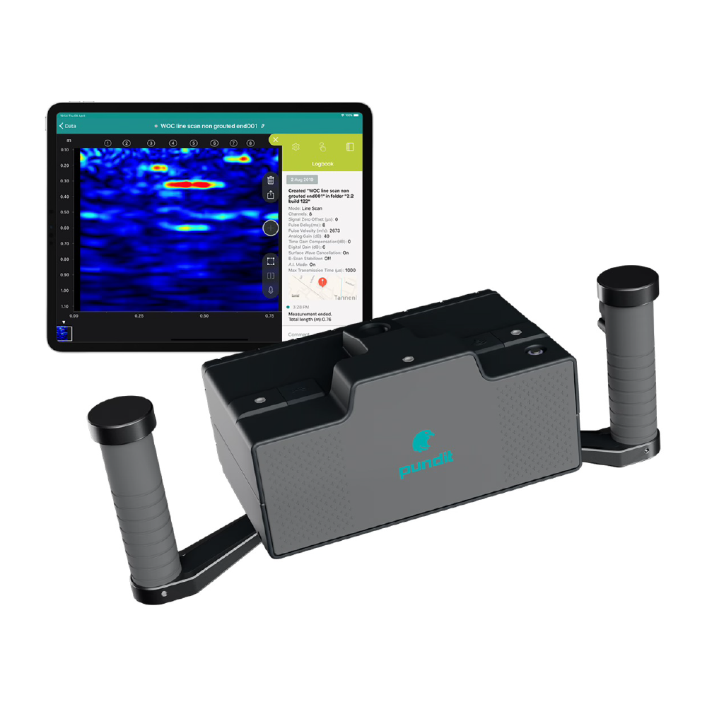 Pundit PD8050 es un equipo ultrasónico avanzado de eco de pulso para imágenes estructurales en concreto. Integra IA y realidad aumentada para detectar defectos, vacíos, delaminaciones y armaduras, generar imágenes 2D y 3D en tiempo real y crear reportes automáticos mediante app inalámbrica.