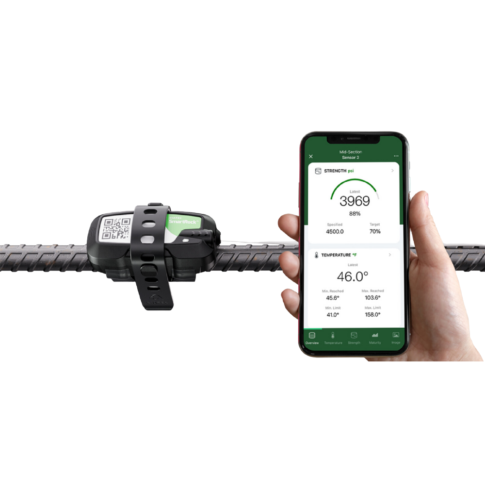 SmartRock 3 es un sensor inalámbrico de última generación para el monitoreo en tiempo real del curado y desarrollo de resistencia del concreto, instalado directamente sobre la armadura sin cables ni mantenimiento. El equipo registra continuamente la temperatura del concreto en dos puntos y calcula automáticamente la resistencia in situ mediante el método de madurez, permitiendo tomar decisiones críticas de obra con total confianza. Los datos se visualizan de forma remota a través de la aplicación móvil y la plataforma en la nube, optimizando plazos, reduciendo riesgos y eliminando la dependencia de ensayos destructivos.